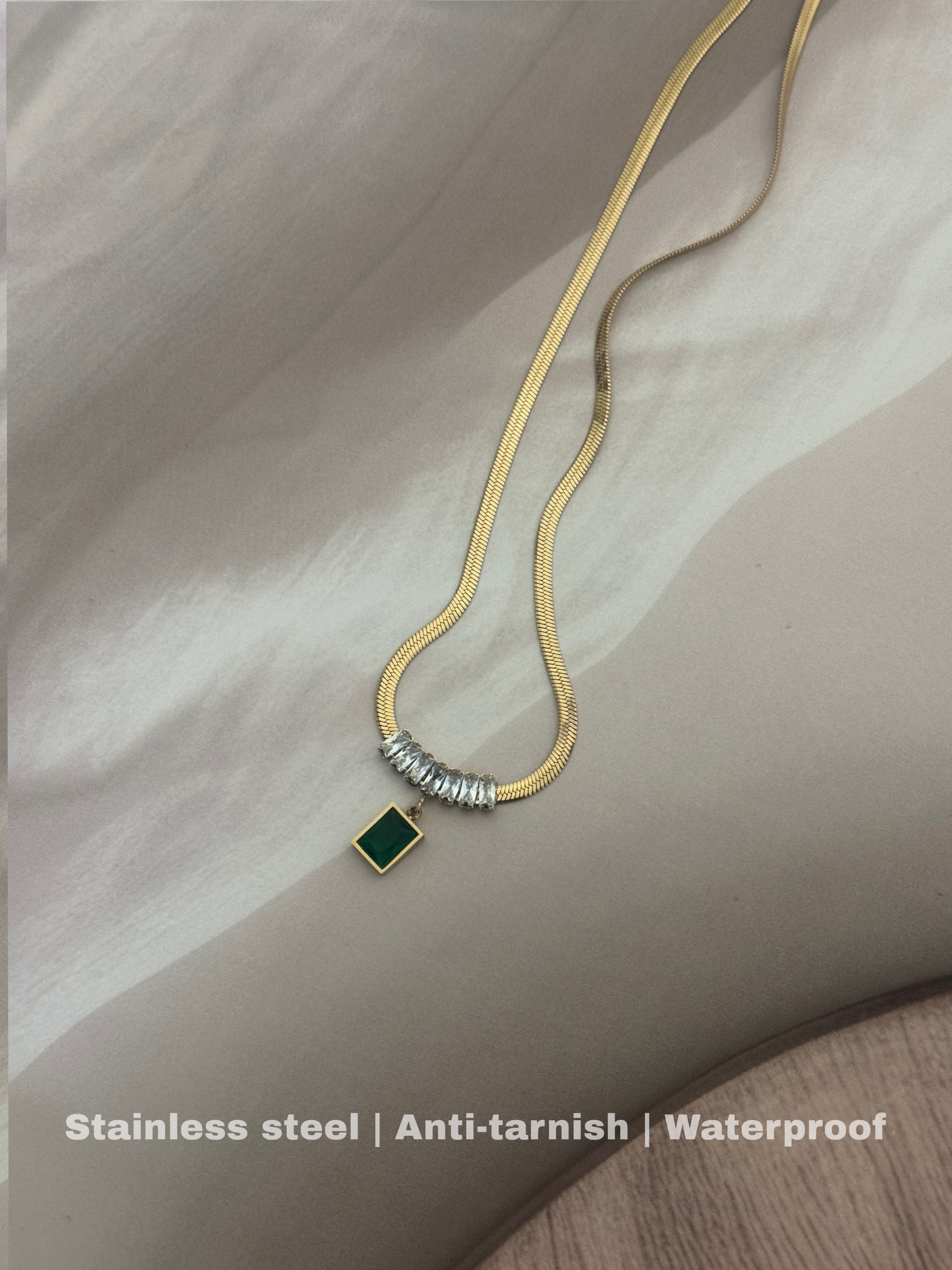"Elevate your style with this chic gold necklace! 💎✨ Made of stainless steel, anti-tarnish & waterproof 💧🔥 Features a stunning green gemstone pendant with silver accents 💚👜 Perfect for everyday wear! Grab yours now!